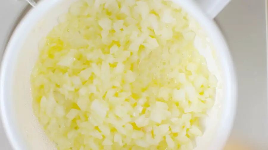 ❷ 把洋葱切成碎末,在热锅里放入黄油,等融化后加入洋葱快炒;