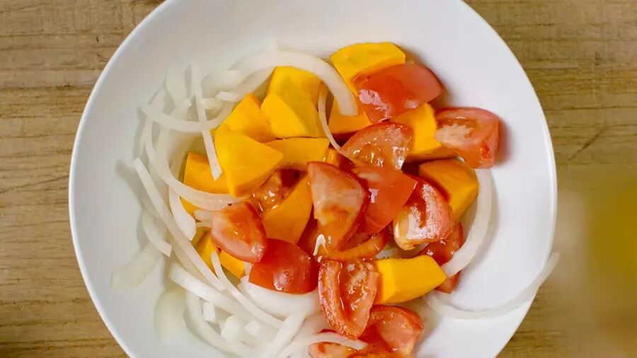 ❶ 南瓜削皮切成一口大小,洋葱切丝,番茄去皮切一口大小,放入耐热容器中;