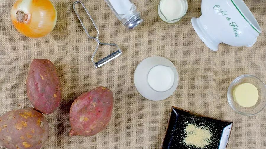 山芋1个,黄油1块,洋葱半颗,鸡汤粉1茶匙,鲜奶油1汤匙,牛奶1杯,盐少许。