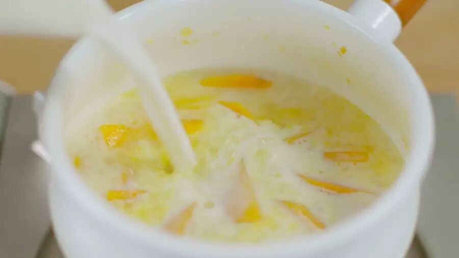 ❹ 山芋煮软后倒入鲜奶油和牛奶,加盐调味,用手持搅拌棒搅至柔滑;