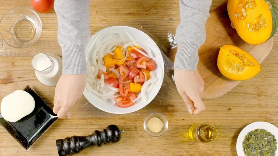 ❷ 在耐热容器内放入南瓜、洋葱、番茄、橄榄油、鸡汤粉和黑胡椒,盖上保鲜膜以强微波加热10分钟后,再放置5分钟;