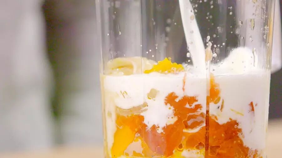❸ 将食材进果汁机搅拌至顺滑,加入牛奶,以盐和胡椒调味;