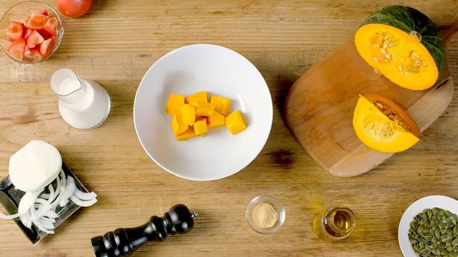 南瓜 200克,洋葱半个,番茄1个,鸡汤粉少许,橄榄油1汤匙,牛奶1杯,盐、胡椒少许;