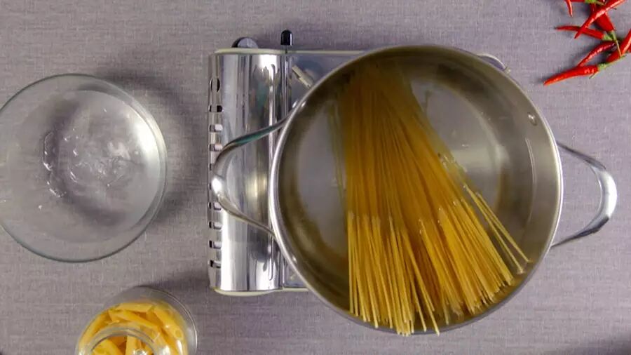 烧开水后,在锅里加点盐,然后放入意面,这样面就会比较有弹性;