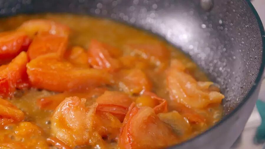 然后在油里加入切片的番茄,焖3-4分钟,让汤汁乳化。(乳化的意思就是使油和水不分离,这能让所有材料混合在一起,口感更顺滑;