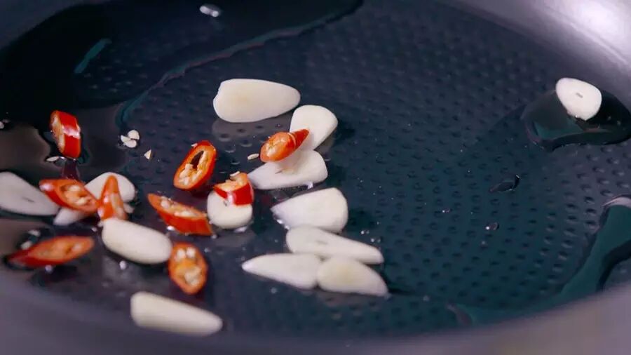 在锅里倒入一点橄榄油,加入切碎的蒜和辣椒,炒到你可以闻到香味的时候,就把蒜和辣椒沥出;