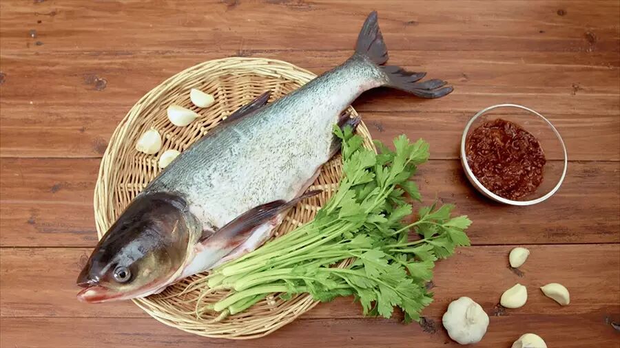 花鲢鱼头500克,蒜1个,豆瓣酱1汤匙,泡椒100克,泡姜100克,食盐适量,料酒10毫升,花椒50颗,食用油适量,小芹菜50克,大葱1根,高汤适量。