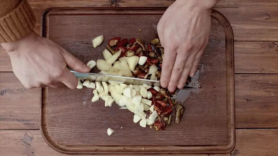然后将去皮的蒜头切块,泡姜切块,泡椒切段,再将它们混在一起,切碎备用;
