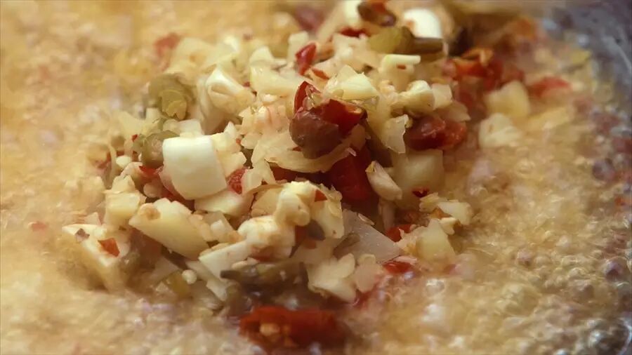热锅倒油,放入花椒爆香,然后放入一勺豆瓣酱,混合切碎的蒜末、泡椒、泡姜一起炒香,炒料的时间要两分钟左右,直至香气溢出;