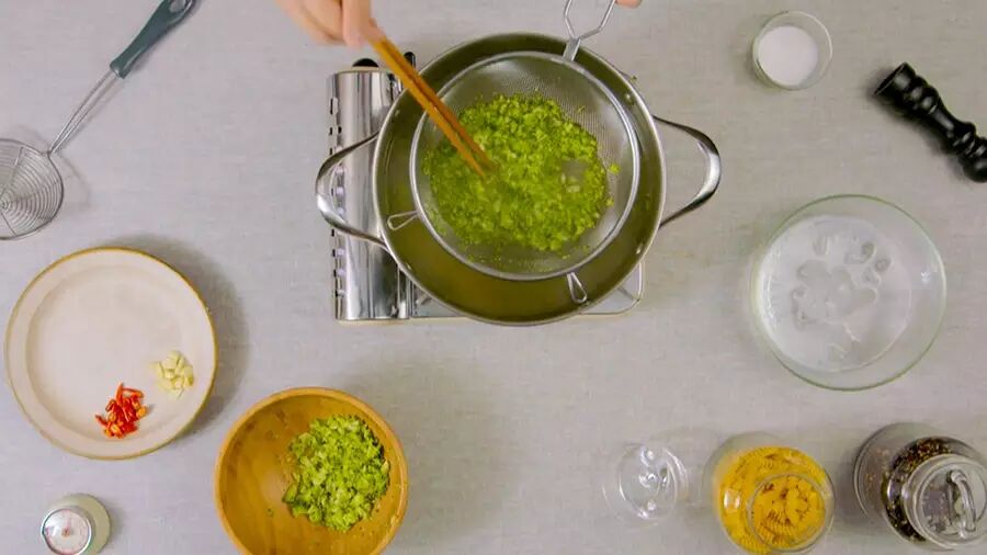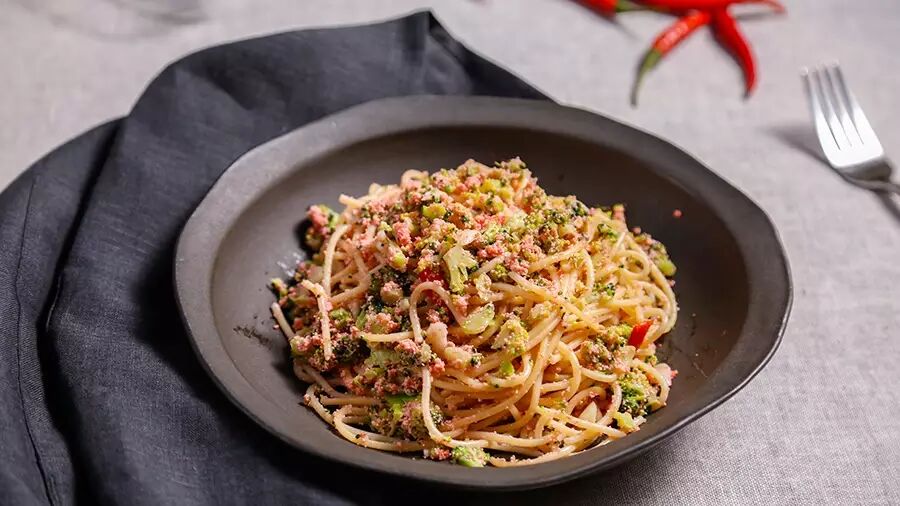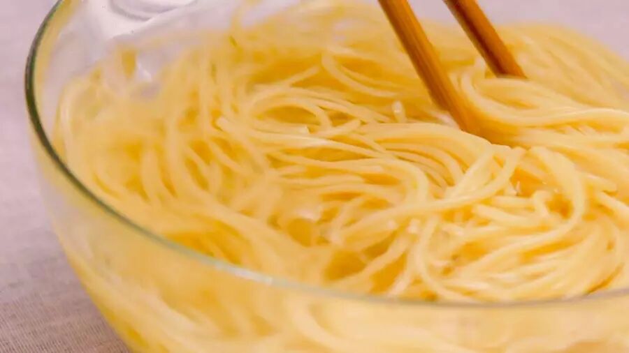 意面用冰水激一下(面条会更弹牙,不会粘连在一起),再沥干;