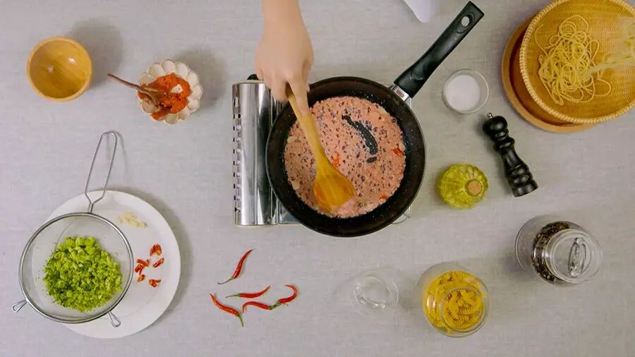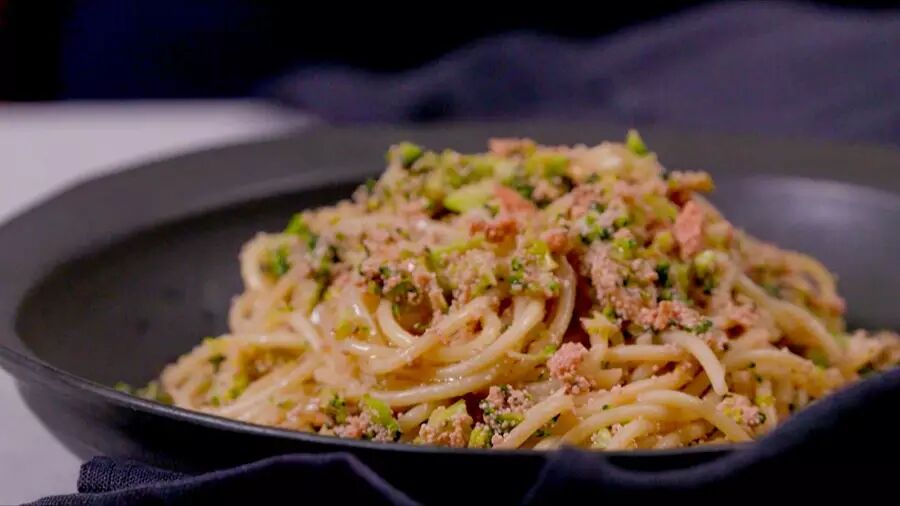 ► 上一期嘉宾Sansan教了大家用日式方法做番茄海胆意面,而今天的这道西兰花明太子意面,属于她自己的配方,其中的明太子是指辣椒和香料腌制过的明太鱼籽,在日韩料理中较为常见。