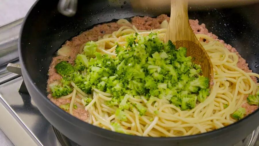 加入意面和西兰花拌匀,可加盐与黑胡椒调味;