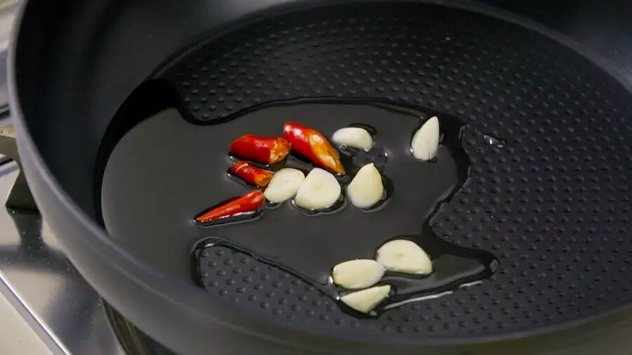 起平底锅加橄榄油,放入切片的蒜片和辣椒,小火炒香;