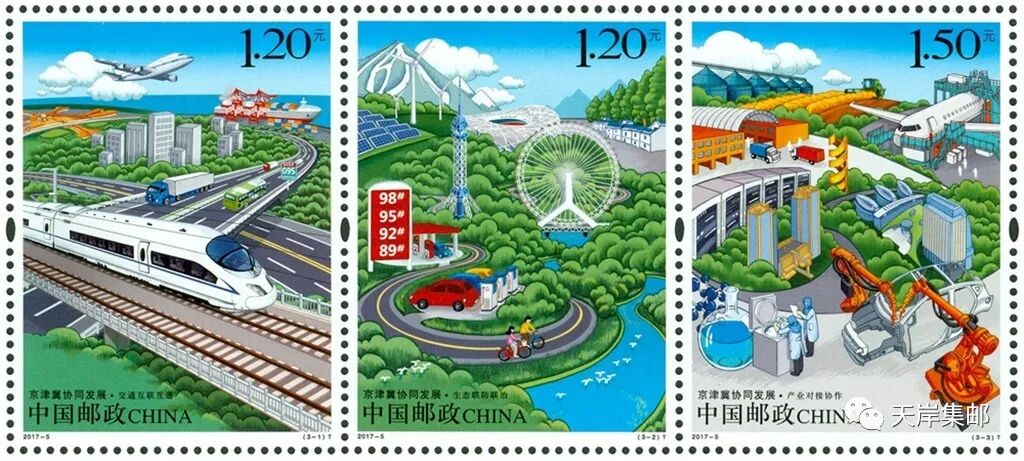 为了呼应习近平总书记提出的京津冀协同发展战略,在方寸间宣传展示国家在注重生态环境治理、打造新型经济圈、城镇化健康发展和国民经济可持续发展方面所取得的成就。中国邮政定于2017年3月9日发行志号为2017-5的《京津冀协同发展》特种邮票一套3枚。