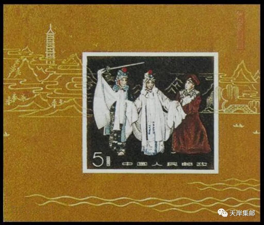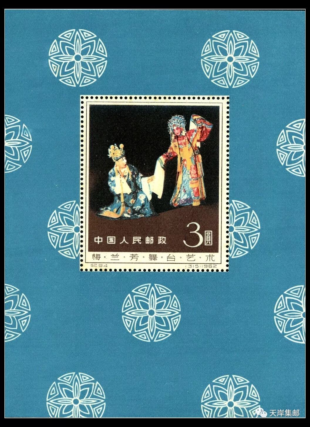1962年9月15日,邮电部在发行这套邮票之后,又发行了一枚小型张。小型张图案是1956年夏天梅兰芳在《贵妃醉酒》中饰演杨贵妃的一幅剧照,由一位日本友人拍摄。画面上,梅兰芳扮演的杨贵妃雍容华贵,姿态优美,那充满怨懑的眼神和紧闭的嘴唇,将杨贵妃内心的苦闷和怨恨,十分传神地表现出来了。小型张采用天蓝色作边饰,上面绘饰着与主图相关联的白色京剧服装八团花图纹。既烘托了主图意境。又使画幅具有浓郁的民族特色。