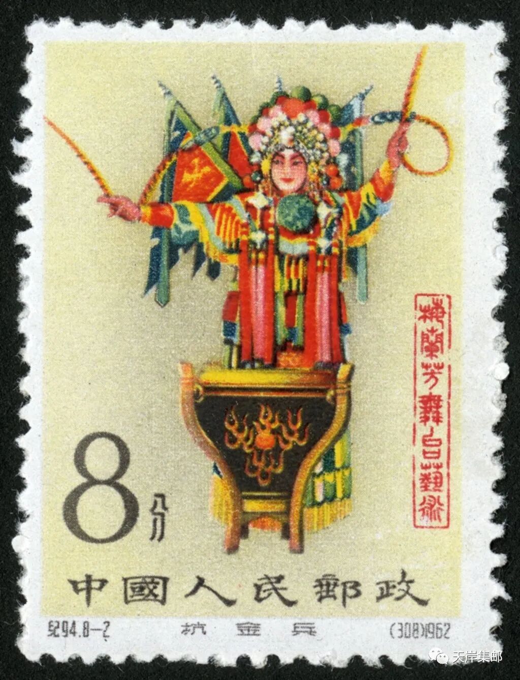 《抗金兵》(308),图案是梅兰芳在《抗金兵》中扮演梁红玉擂鼓助威的形象;