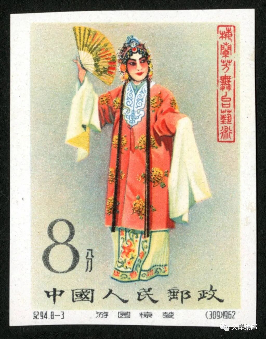 《游园惊梦》(309),图案是梅兰芳在《牡丹亭》的《游园惊梦》一折中饰演杜丽娘的形象;