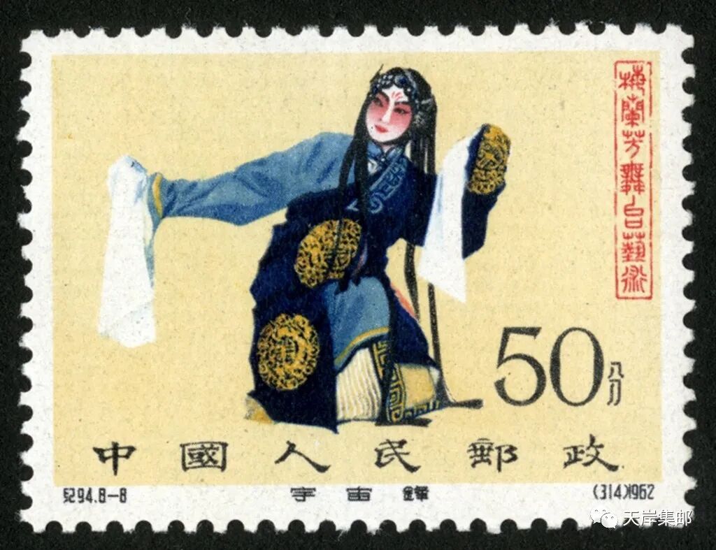 图案中是梅兰芳饰演赵艳容金殿装疯,正唱“倒卧在尘埃地信口胡言”时的身段。《宇宙锋》是梅派高难度经典剧目。这枚邮票图案描绘的‘‘金殿”一场戏中,梅兰芳结合唱腔,迅速地挥舞双袖,向右旋转;然后将水袖翻起,慢慢地蹲下身来。表现出赵艳容又气又愤、似真似假的疯态,给人以美的感受。