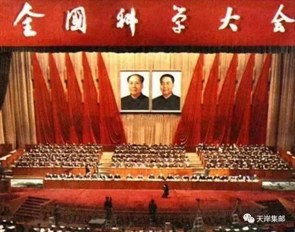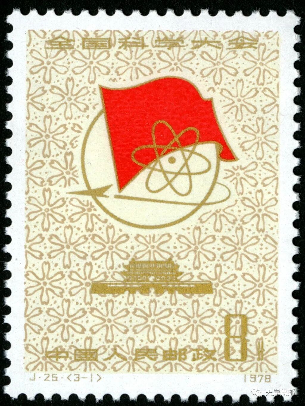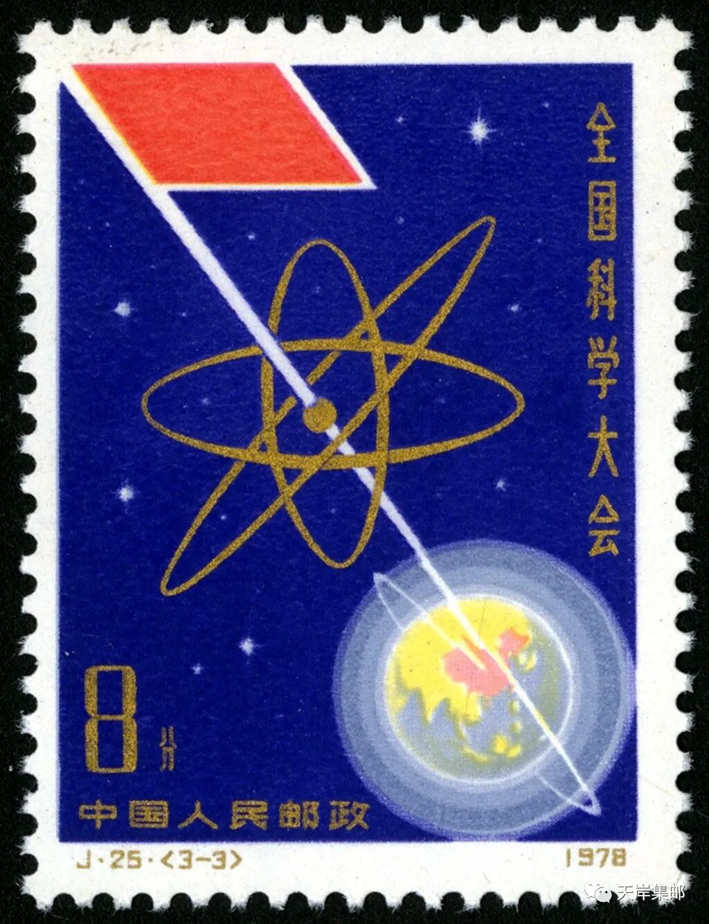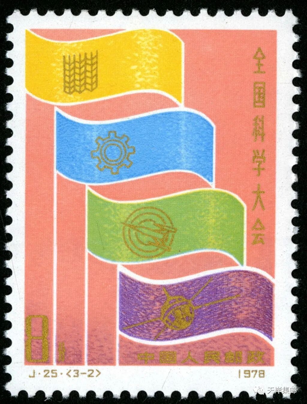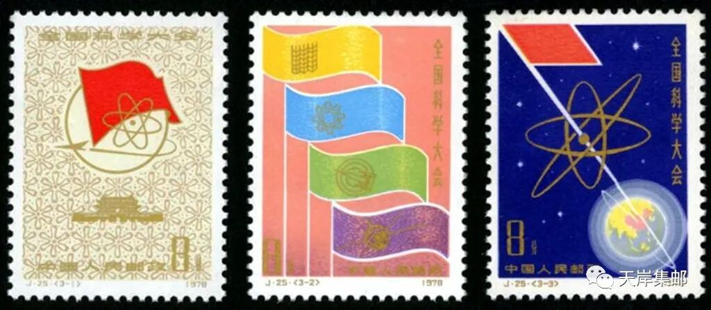 1978年3月18日,为了庆祝全国科学大会胜利召开,中华人民共和国邮电部发行一套志号为 J25的《全国科学大会》纪念邮票。邮票全套三枚,科学的春天(3-1)中的图案是全国科学大会会徽;向四个现代化进军(3-2)图案是四面不同颜色的旗帜;努力攀登科学高峰(3-3)图案描绘了原子模型、地球、外层空间和红旗等形象。