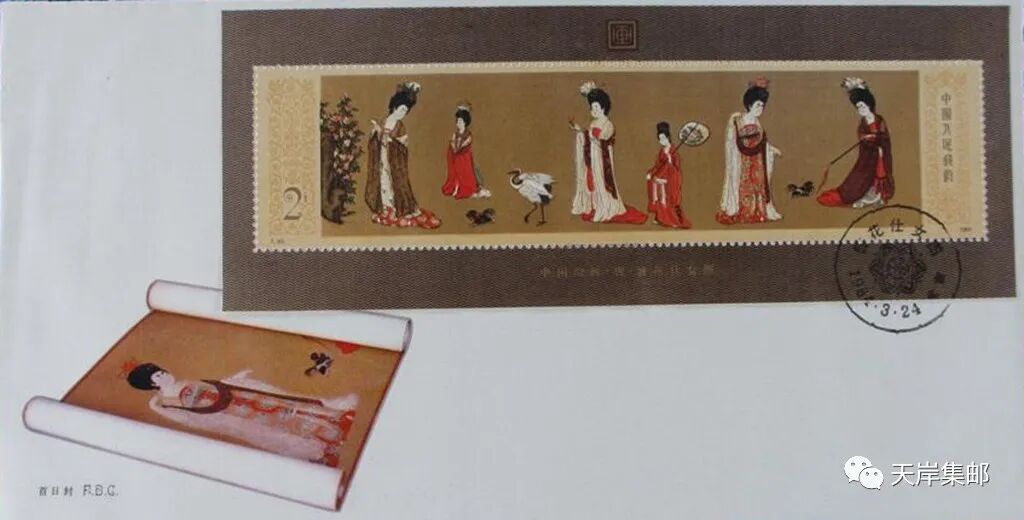 中华人民共和国邮电部在发行这套邮票的同时,又发行了一枚《中国绘画·唐·簪花仕女图(小型张)》。图案采用了中国唐代周昉的《簪花仕女图》全卷。画卷描绘了“捉蝶”、“看花”、“漫步”、“戏犬”四个不同的生活场景,塑造了五个盛装的贵族妇女和一个打着团扇的婢女形象。