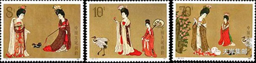 这套邮票图案采用中国画装裱技术上的“通景”形式,大胆地将《簪花仕女图》长卷裁成三个画面。所谓“通景”,即将大幅山水画纵向裁制若干等份,分别装裱成直幅,单独悬挂可独立成画,并排在一起又合成整幅画卷。设计者在将《簪花仕女图》裁为三截时。勇于在白鹤正中落刀,并对两边剪残的景物进行合理取舍,小心收拾,该补全的补全,该舍去的舍去,该保留的保留,处理精巧,不失原画精神。原画卷上盖着“乾隆鉴赏”、“宣统御览之宝”、“御书房鉴藏宝”、“乾隆御览之宝”等13方印玺,这对画史研究大有裨益,但对欣赏原画并无帮助,设计者果断地抹掉大大小小的印章,还画卷以唐代原貌,实属成功之举。