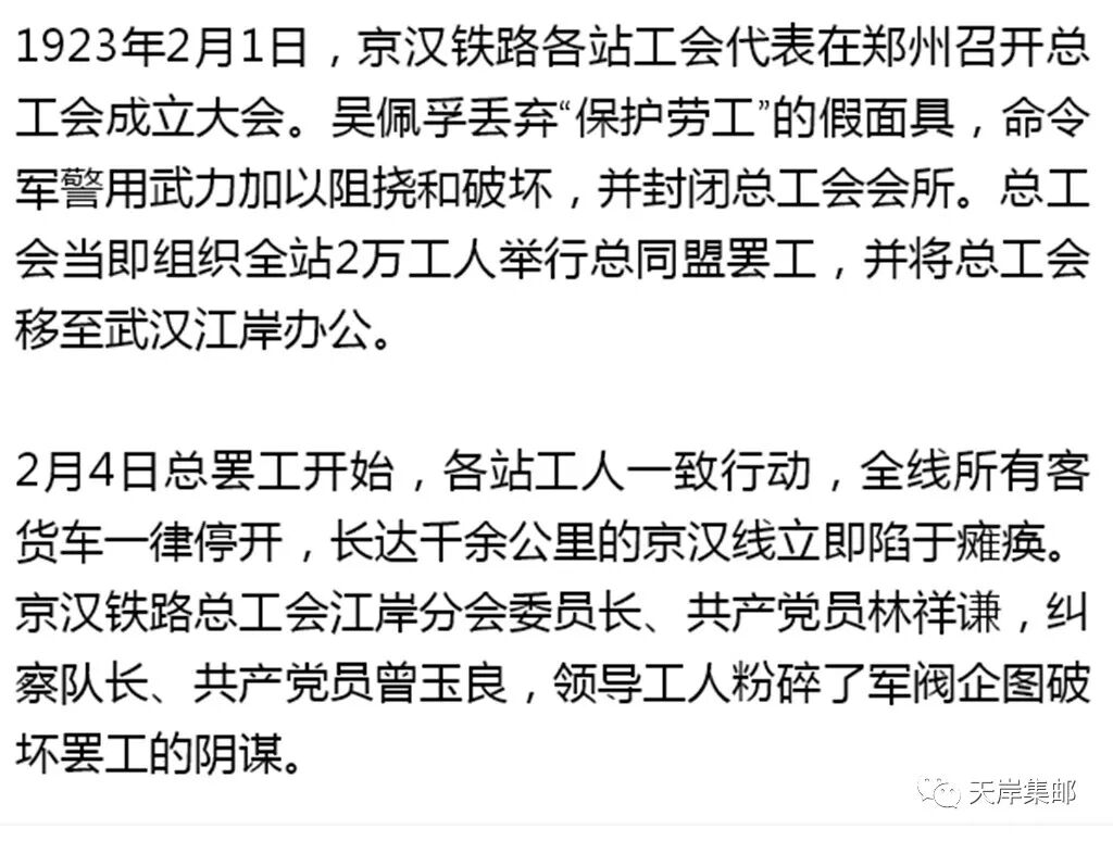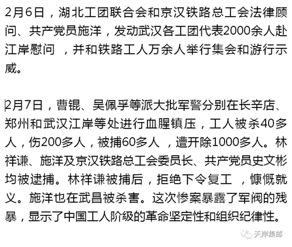 1923年2月7日在吴佩孚的命令下湖北督军萧耀南借口调解工潮,诱骗工会代表到江岸工会会所“谈判”,工会代表在去工会办事处途中,遭到反动军队的枪击,赤手空拳的工人纠察队当场被打死30多人、打伤200多人,造成了震惊中外的“二·七”惨案。