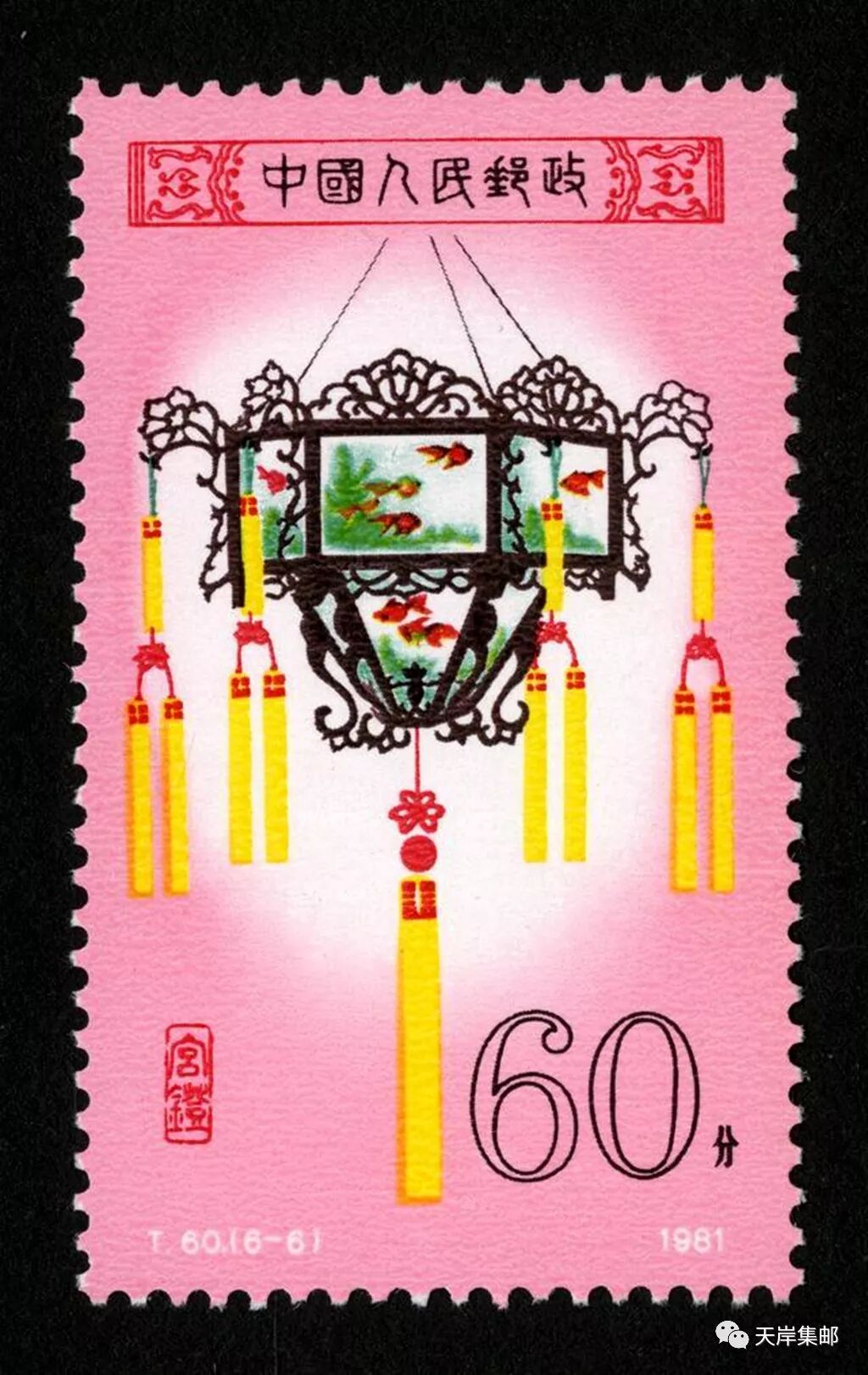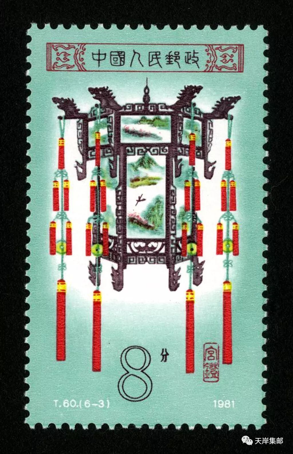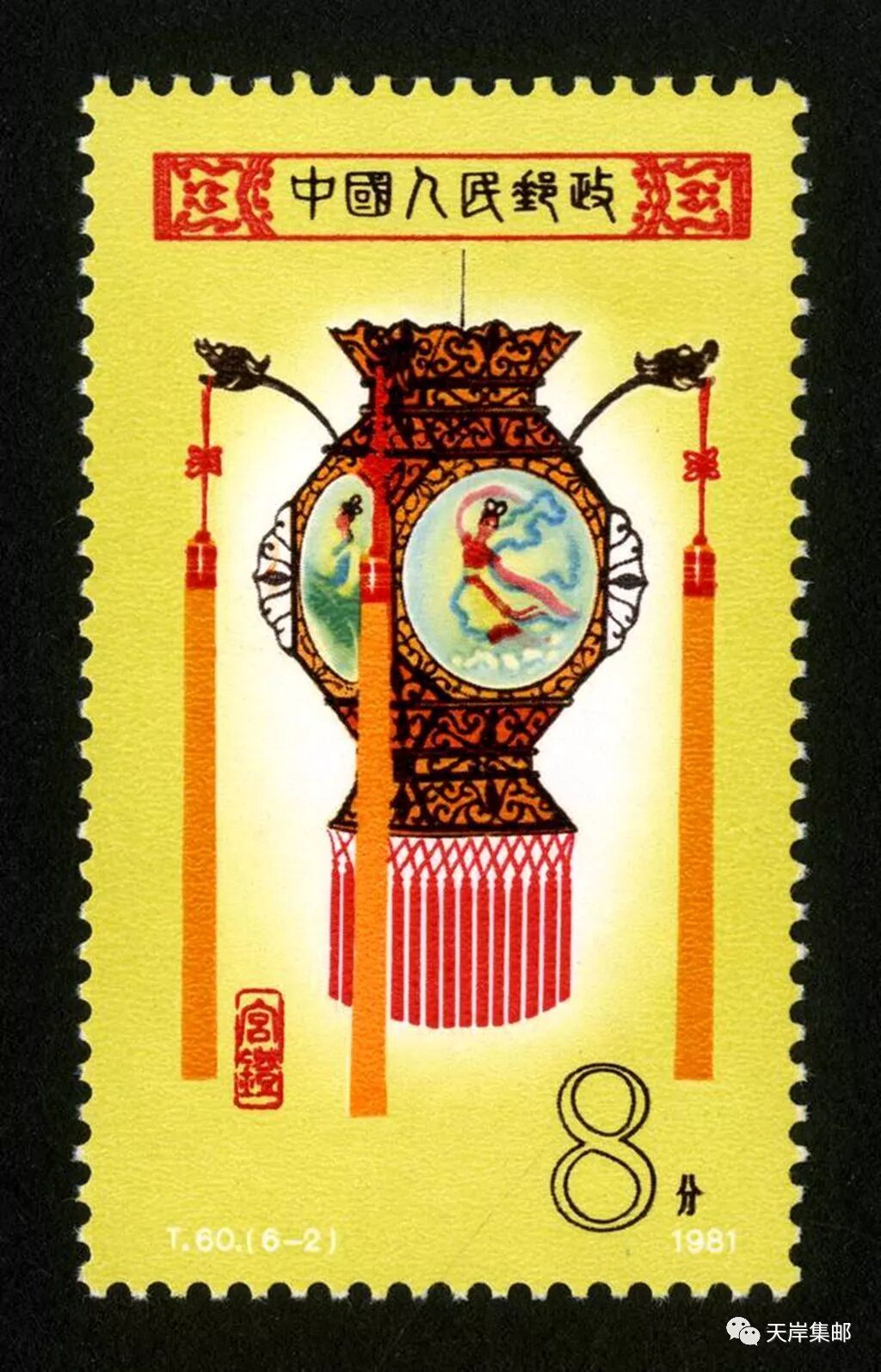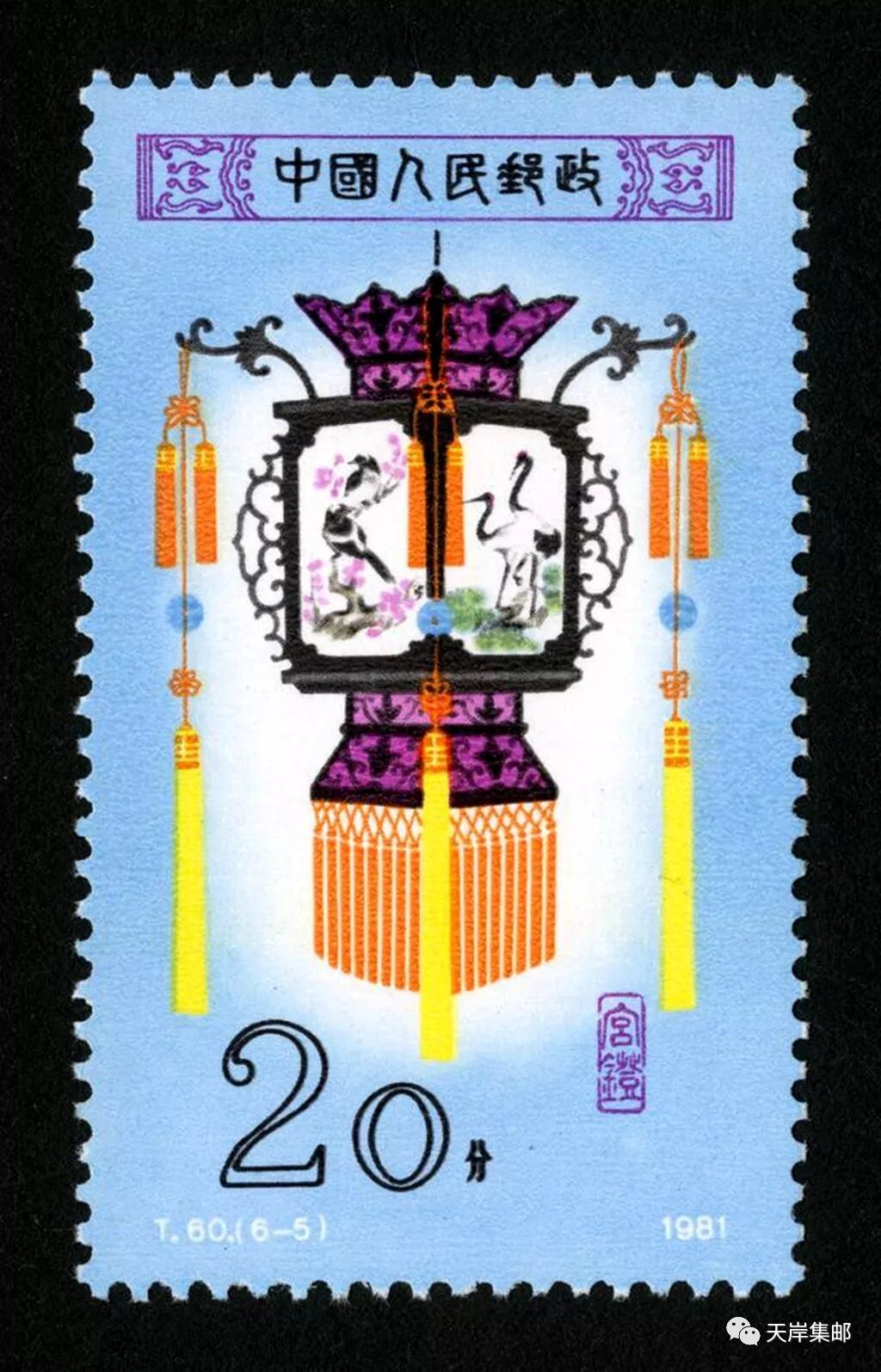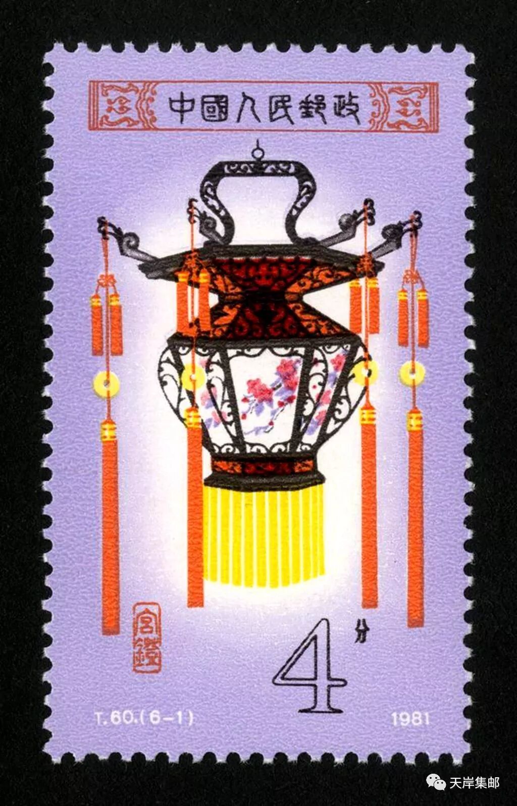 我国原邮电部于1981年2月19日发行了志号为T60的《宫灯》特种邮票,全套6枚,邮票设计者为邹建军。邮票图案分别为:“花篮灯”“龙球灯”“龙凤灯”“宝盆灯”“草花灯”和“牡丹灯”。