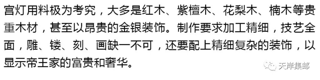 正统的宫灯造型为八角、六角、四角形,各面装饰有画屏,其图案内容多为龙凤呈祥、福寿延年、吉祥如意等内容。