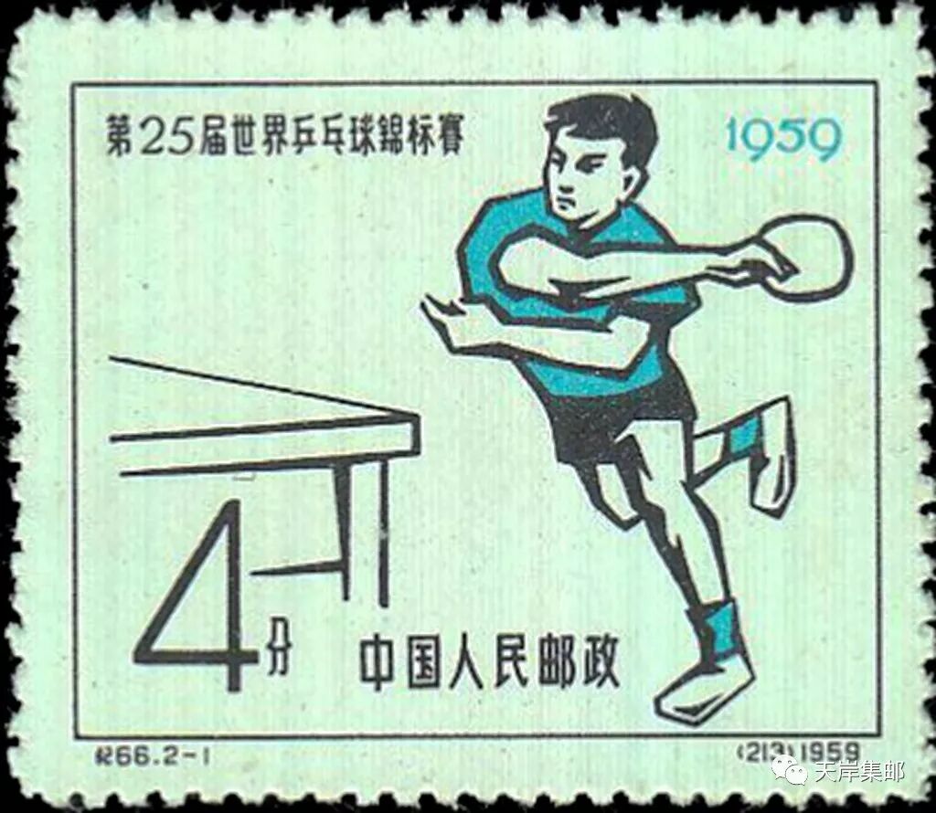 中国邮电部于1959年8月30日发行志号为纪66(编号213-214)的《第25届世界乒乓球锦标赛》邮票,全套2枚。该邮票由万维生设计,北京人民印刷厂印制。