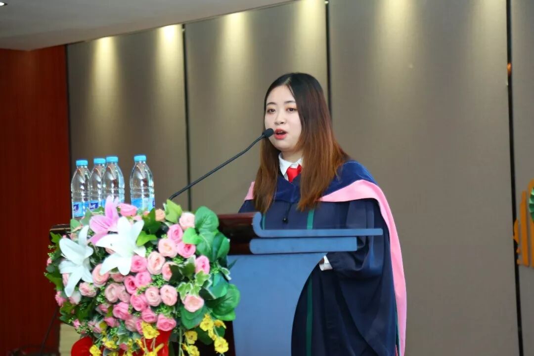 在2019届研究生代表梅燕秋发言中,她回忆了在国金生活中的点点滴滴,讲到正是这些生活细节赋予了她无穷的力量和积极的人生态度。接着她分享了求知的背后就是一种简单和纯粹的快乐,同时求知也是一件困难并且需要毅力坚持的事情,但正是求知的快乐与艰辛交织了大家这些年的成长。最后,她代表同学们向学校、学院与老师们致谢。