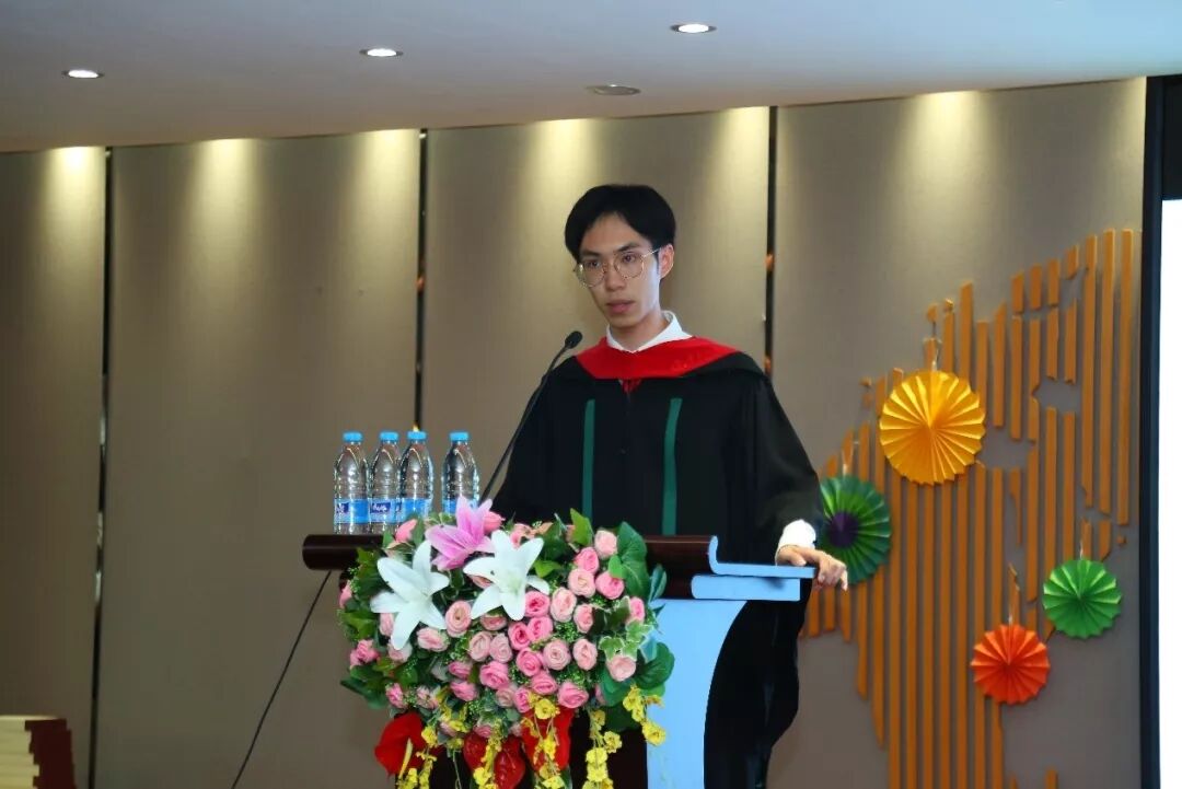 2019届本科生代表周梓洵同学发言。他先是回忆了与老师和同学们共同经历的四年校园生活,十分珍惜怀念与学院与同学共同成长的岁月。最后,他代表同学们感谢了学校、学院和老师们的培养,用歌词表示对大家的祝福:愿我们红尘作伴,活得潇潇洒洒,策马奔腾,共享人生繁华。