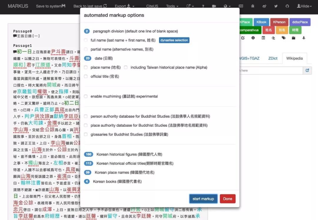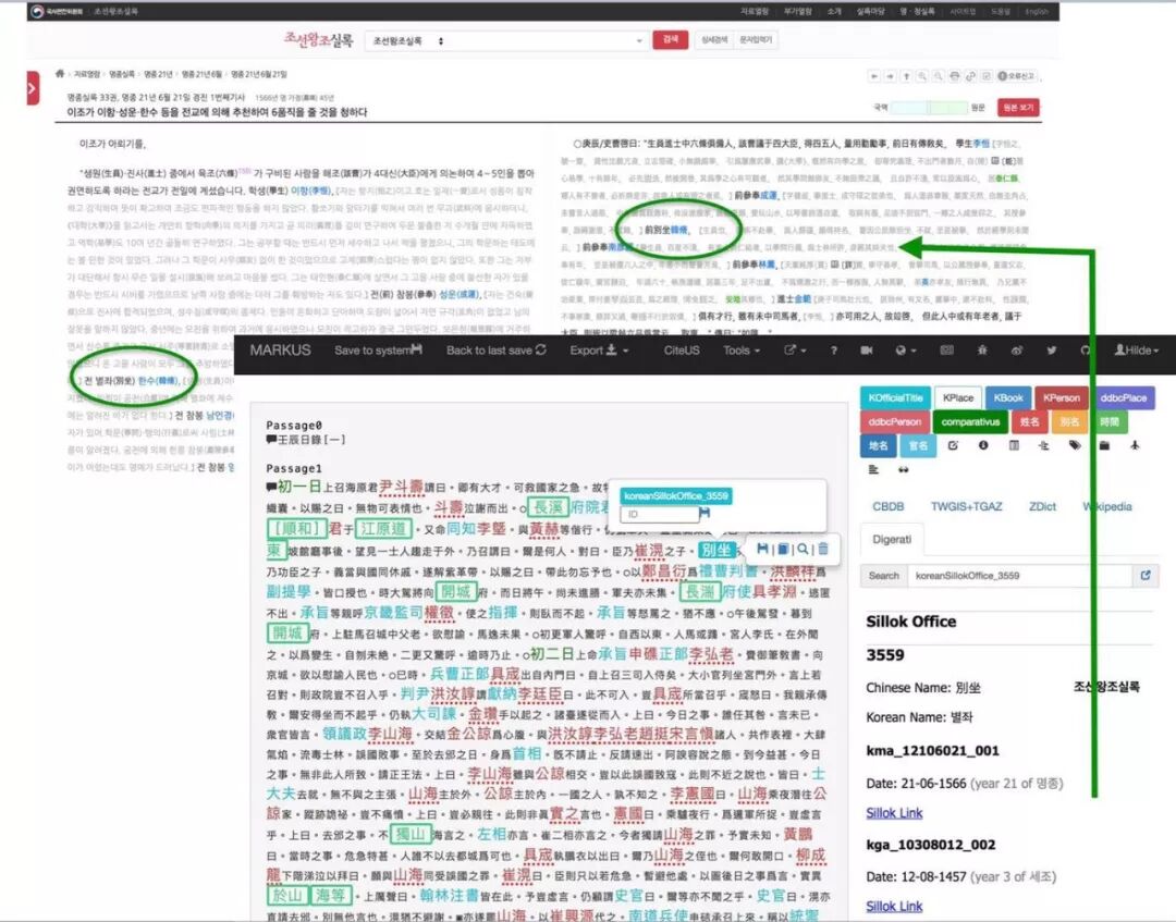 該平臺於2014年4月一經上線,便好評如潮,在團隊的持續努力和眾多用戶的支持下,獲2016年數字人文獎(DHAwards 2016)最佳工具獎項第三名。此次萊頓大學團隊對平臺進行了重大升級,在原先可標注中國各種古籍文獻外,傾力推出了韓文版,可標注韓國古籍文獻內人名、地名、書名以及官職名稱,更重要的是!標注的內容將自動和百科詞典、朝鮮王朝實錄、古地圖以及韓國文集叢刊直接鏈接!強烈推薦給各位需要閱讀韓國古籍文獻的朋友們~~~