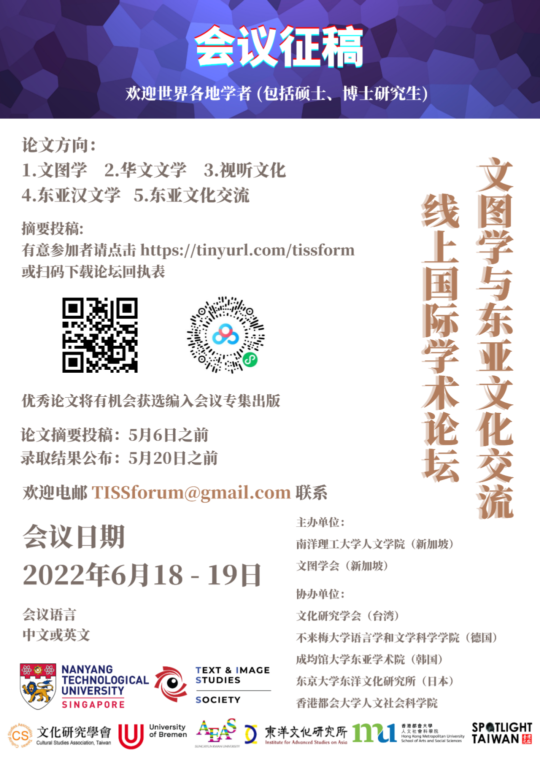 有意参加者请扫描海报中的二维码,下载论坛回执表,并于2022年5月6日(周五)前,将填写完毕的文件寄至TISSforum@gmail.com,邮件标题请注明“姓名+回执表”。论文摘要一经录用,将会在 2022年5月20日(周五)之前以电邮通知。论坛结束后,发表人可于7月18日(周一)之前,将论文全文发送至 TISSforum@gmail.com,优秀论文将有机会获选编入会议专集出版。