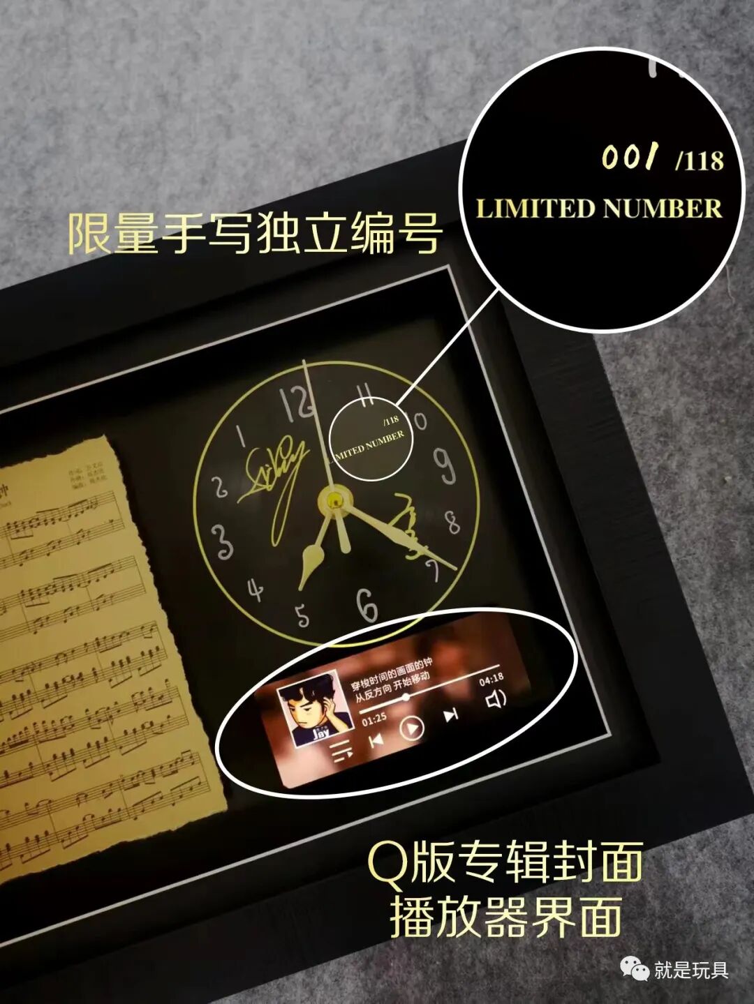画面下方,则印有Q 版专辑《Jay》图案的音乐播放器界面,并在表盘中附带手写限量编号
