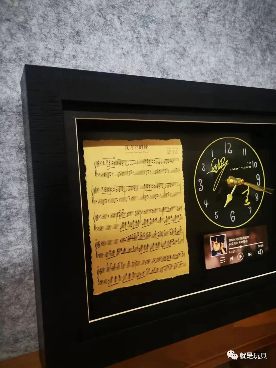 在黑胶唱片背景的表盘上,可以看到印有周杰伦与《反方向的钟》词作者方文山的手写体复刻签名