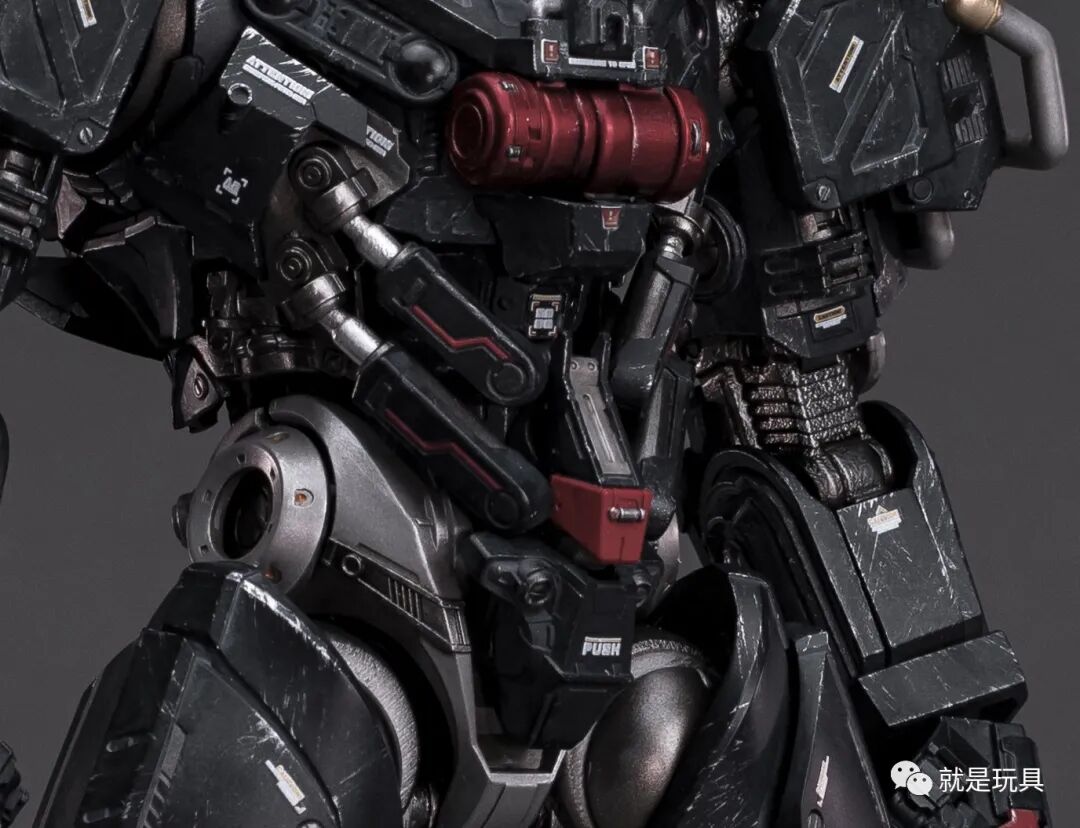 这款破晓机体表面带有金属磨损质感刻画,官图中腰部,大腿与脚踝处外露的液压管都为真实结构,可以和机甲的动作联动