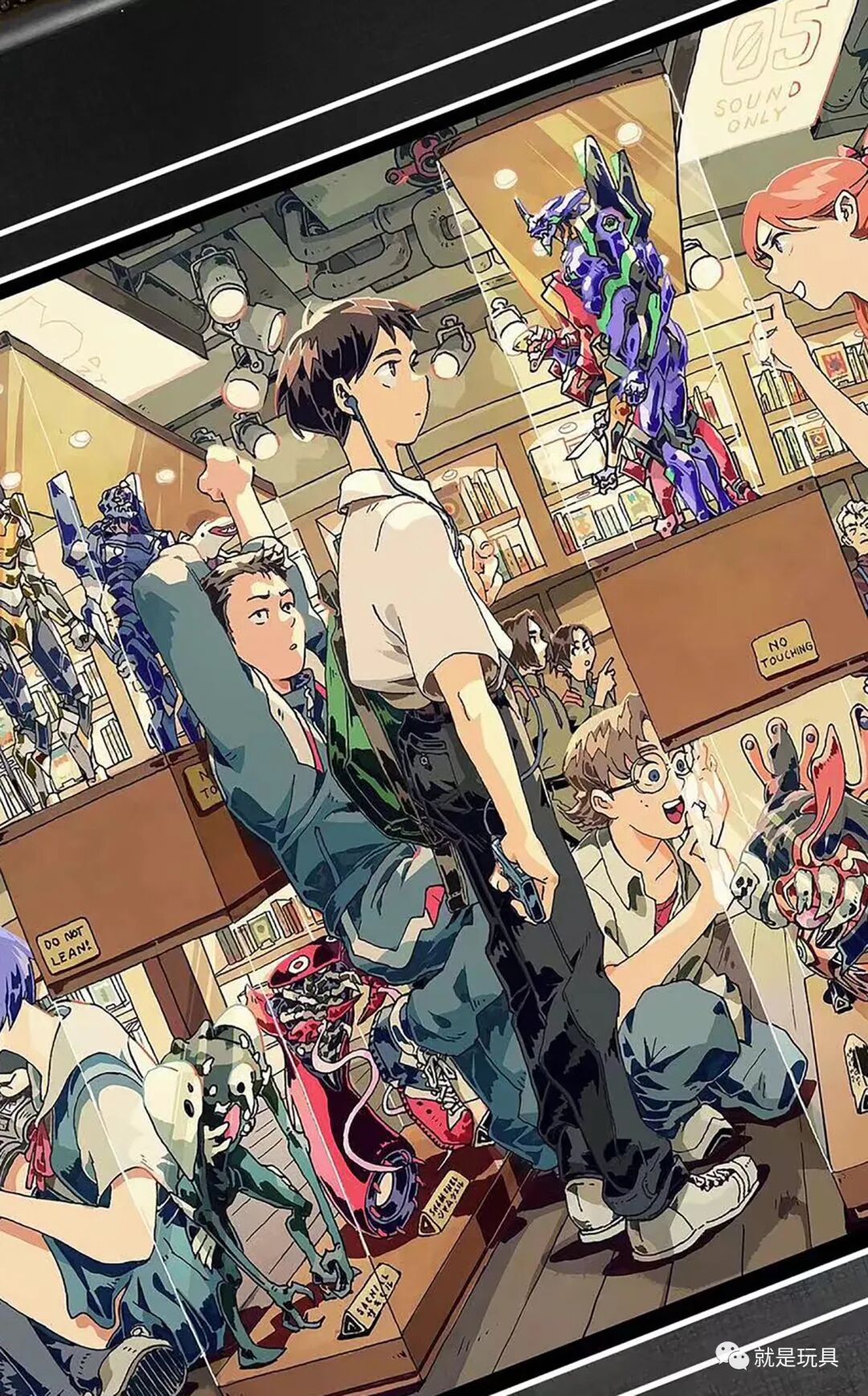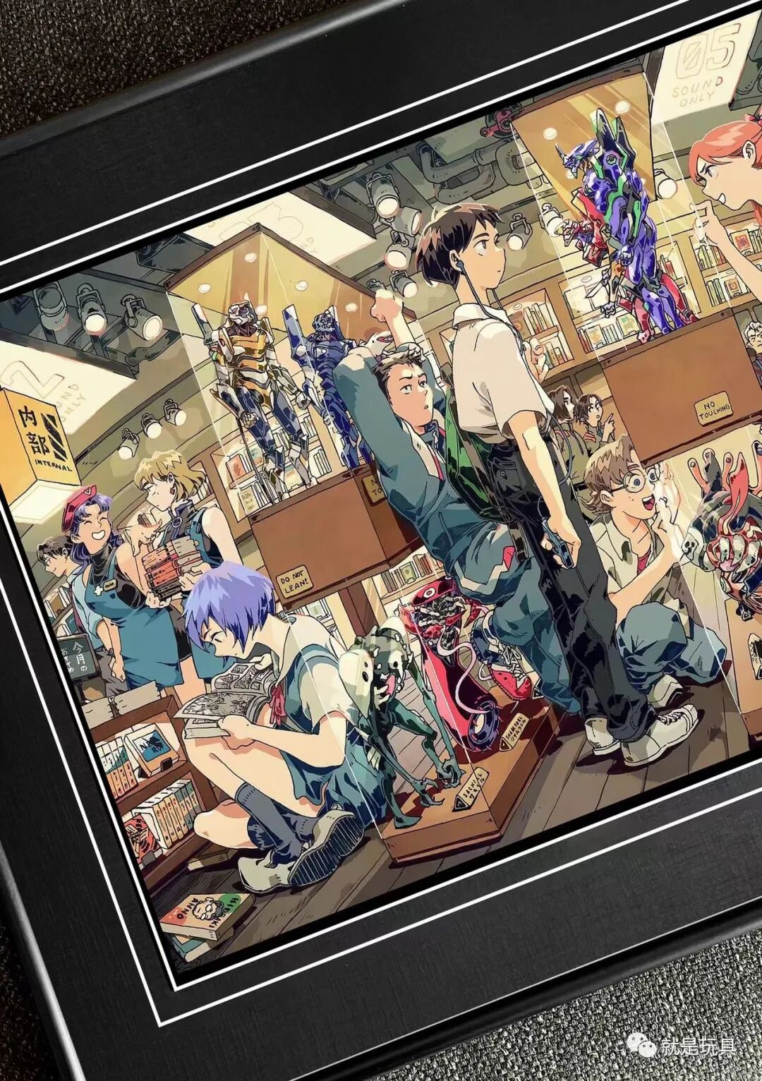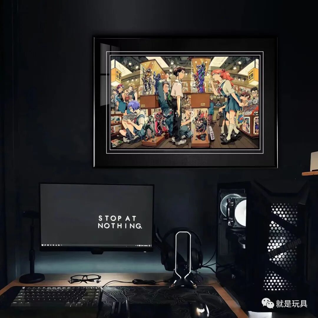 这款画作尺寸38×53厘米,画面里除了展柜中的EVA各型号机模型,还有使徒手办和漫画,满满的细节彩蛋非常耐看