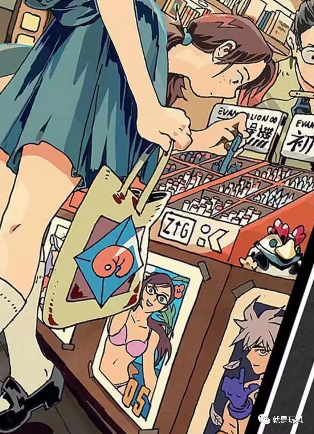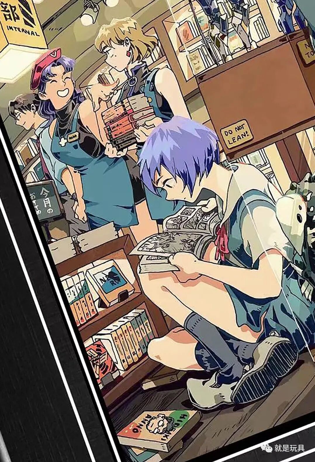 画面左下角绫波丽正在专心看着EVA漫画,脚边图书的封面上还画着碇司令...远处两位店员小姐葛城美里和律子,则在加持面前争风吃醋