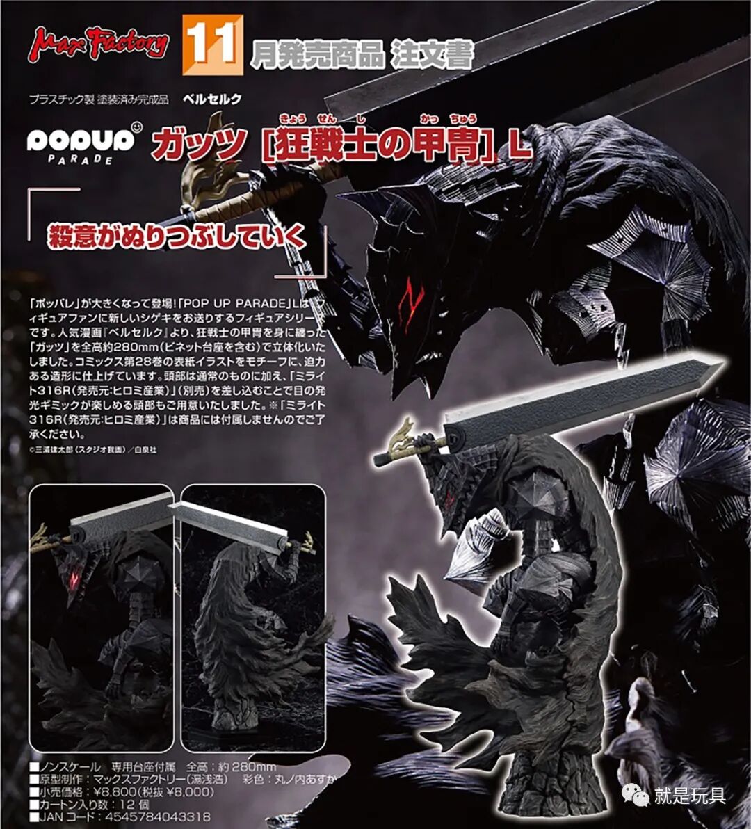 Max Factory POP UP PARADE系列近日开订了一款《剑风传奇》中格斯的狂战士盔甲手办新品,高28厘米的巨大尺寸售价仅400元,可以说是目前为止性价比最高的《剑风》手办!