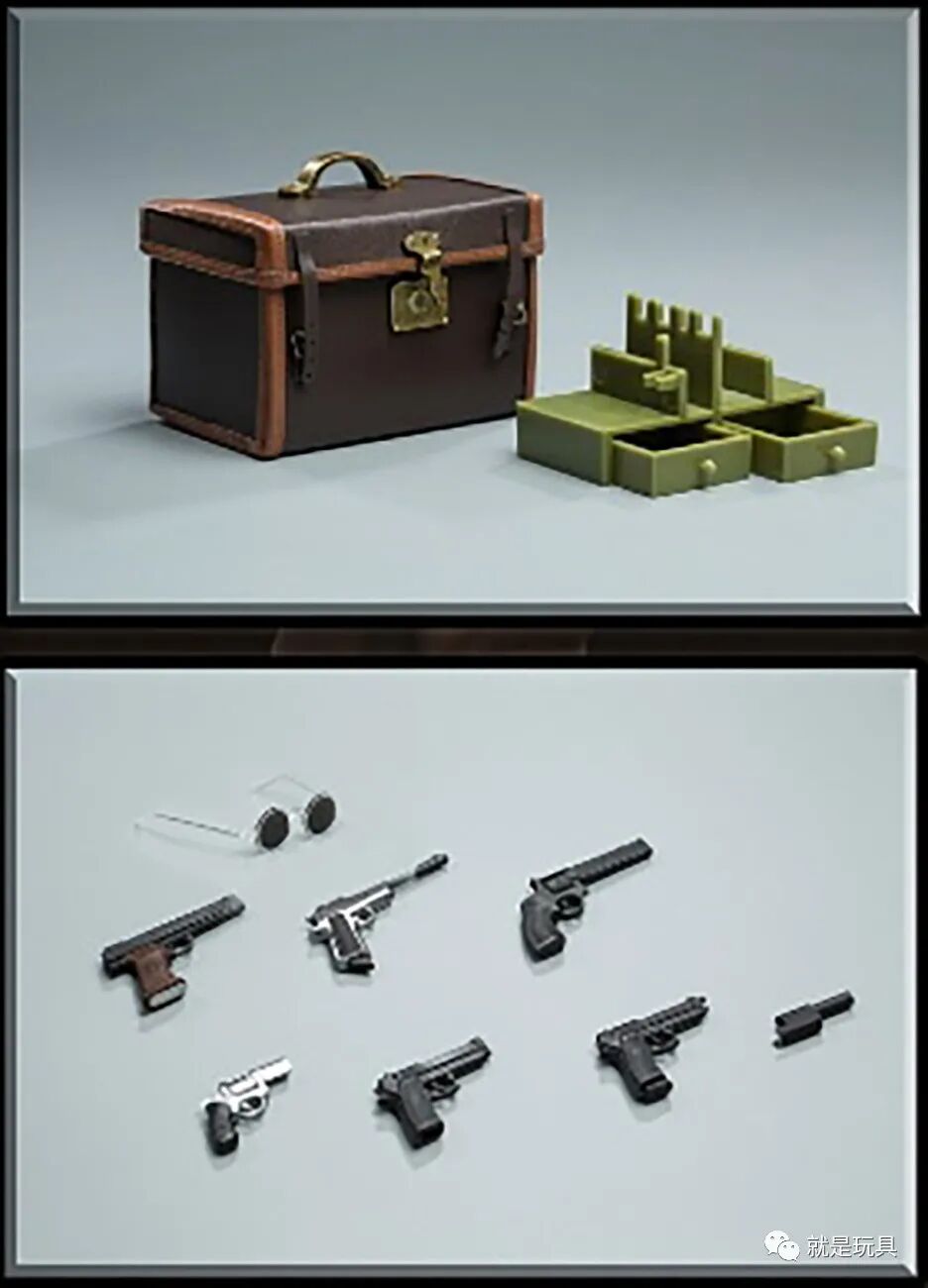 这款武器箱打开里面内置有带抽屉的武器架,并可以收纳共6把不同手枪+6枚手雷与一把匕首!