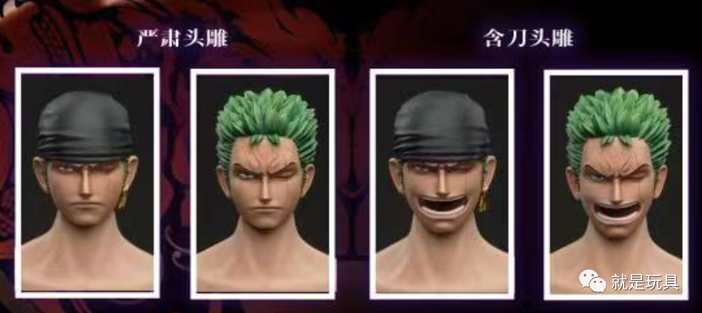 头雕有绿色海藻头和头巾造型两款,面雕也附带了嘴里含刀的替换表情脸,等于这款索隆可以组合出4种不同的头部造型!