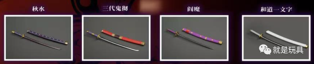4把合金刀分别是秋水,阎魔,和道一文字和三代鬼彻,其他配件还包括刀架,两张通缉令,和一只索隆造型的电话虫
