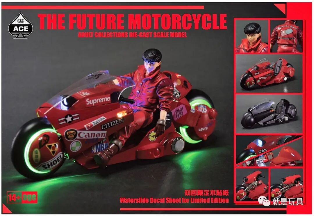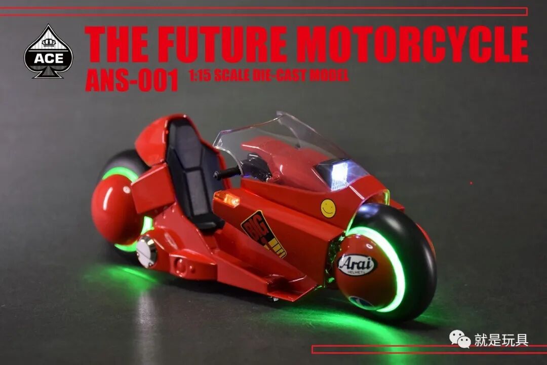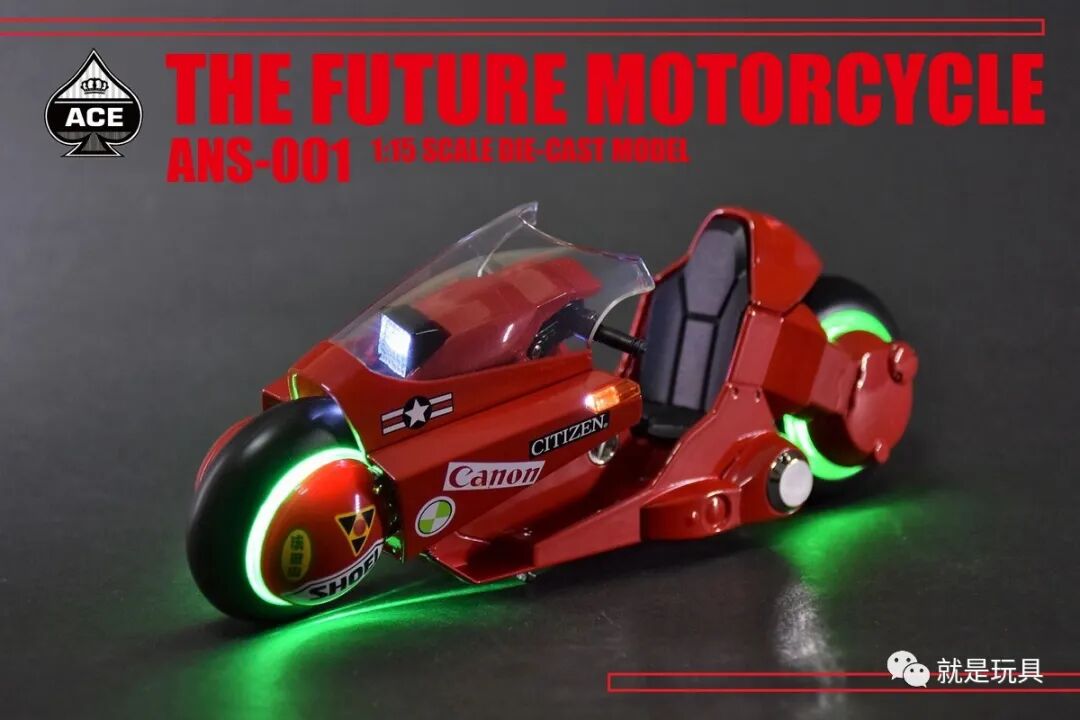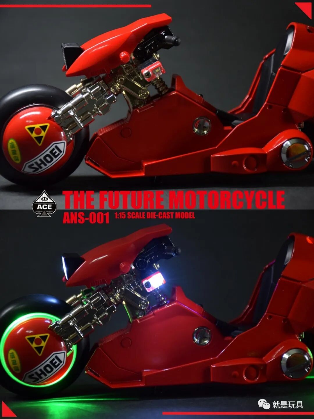 ACE TOYZ明天截单一款《阿基拉》合金摩托机车,有红色和黑色两款可选,车身光效点亮后科幻效果十足!