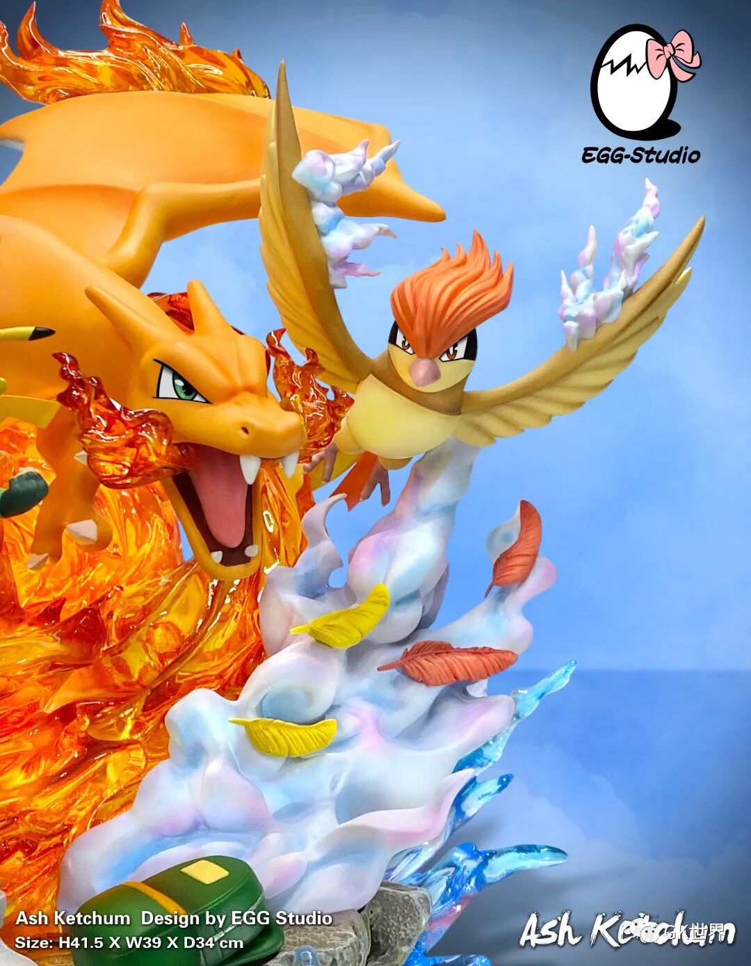 这款雕像高41.5厘米,整个画面中小智与皮卡丘位于中心,手握精灵球的造型相当帅气!周围除了陪伴小智左右的宝可梦外,还有草地、海浪、火焰和狂风等特效间烘托氛围,细节刻画非常丰富