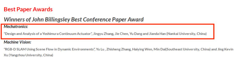 该项研究工作以论文“折纸连续体机器人的设计与分析”(“Design and Analysis of a Yoshimura Continuum Actuator”)为题日前获得第28届IEEE M2VIP的最佳会议论文奖(John Billingsley Best Conference Paper Award)。该工作由南开大学硕士生张静宇、博士生陈杰等共同完成,人工智能学院韩建达教授、青年教师党宇博士担任指导教师。