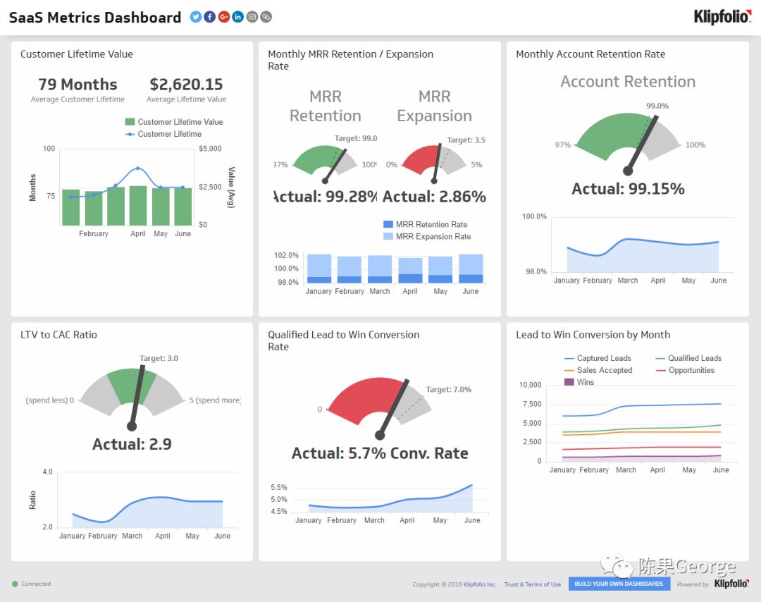 SaaS商业的衡量指标除了这些财务指标外,还包括类似于NPS等顾客忠诚度指标,由于互联网商业数据驱动的特点,建立下图这样可视化的SaaS指标板,可以对SaaS商业健康度进行实时的监控: