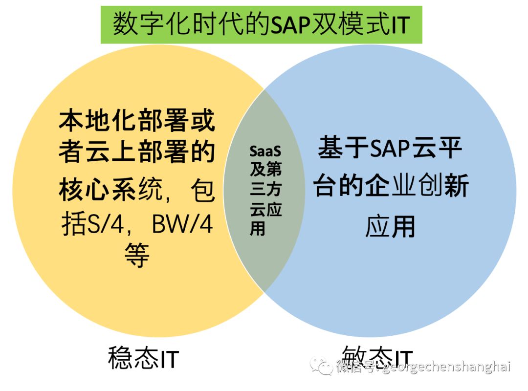 如上图所示,SAP SCP定位于企业的数字化平台,一方面和本地安装的企业核心系统集成,即S/4 HANA(及其扩展应用)、BW/4 HANA,另一方面连接企业的各种公有云SaaS服务,在此之上,向用户交付创新的数字化应用。一端是以S/4为代表的传统的稳态IT系统,另一端是基于云平台的创新的敏态IT系统,这非常符合当前企业“双模式IT”的数字化潮流。
