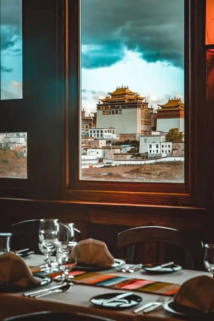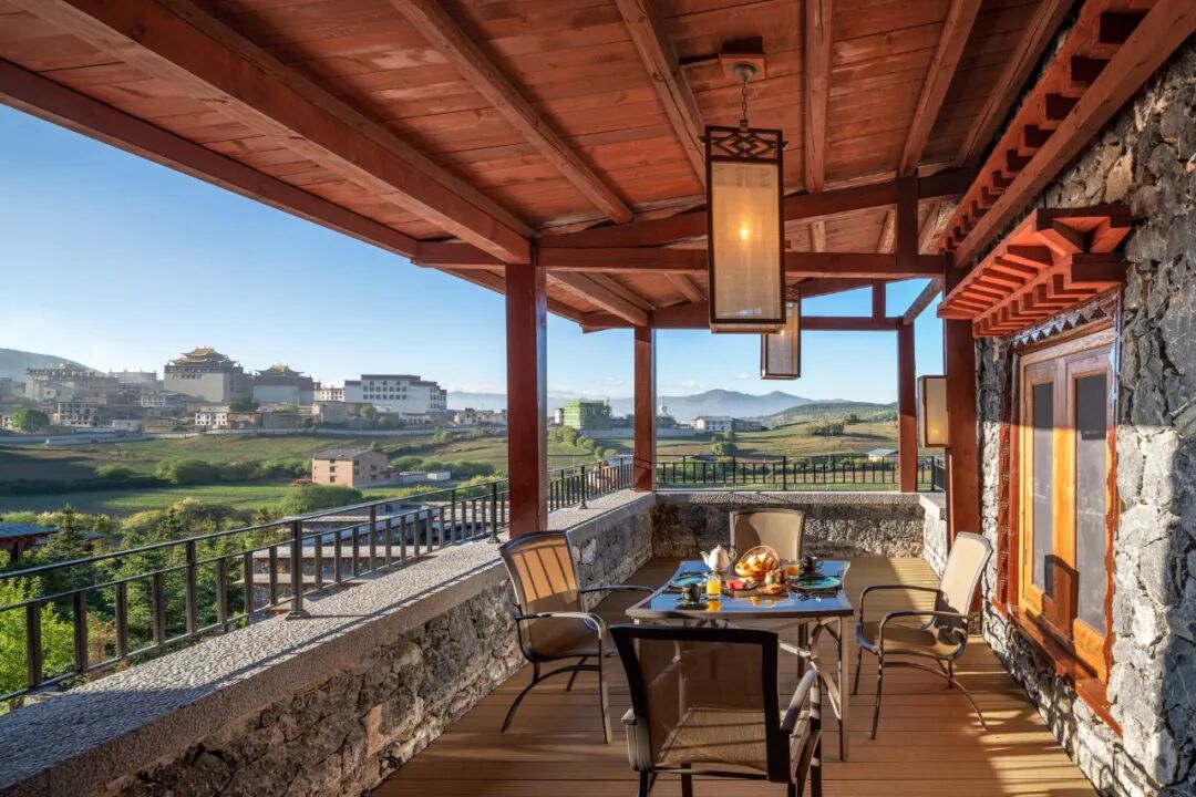 在这里每天入睡前的一盏精油香薰,清早一杯新鲜牛奶。能感觉到酒店用心营造的家的氛围。清晨起床推开门,步入阳台,对面是松赞林寺上空的惊艳晨曦。牛羊的铃铛声、鸟叫声声声入耳,又免不得惊叹一番。