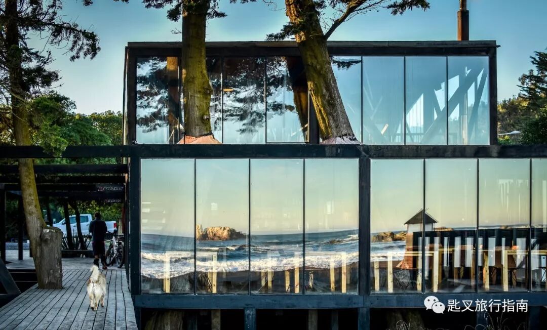 这个看似头重脚轻的木屋将公共区域再次回归到自然, 敞开式的开放空间让Chiloé岛温和的海风无阻力抚过。而透过这片玻璃幕墙打造的天然画框让远处顶着雪盖的安第斯山脉成为你用餐的伙伴。