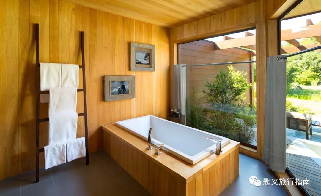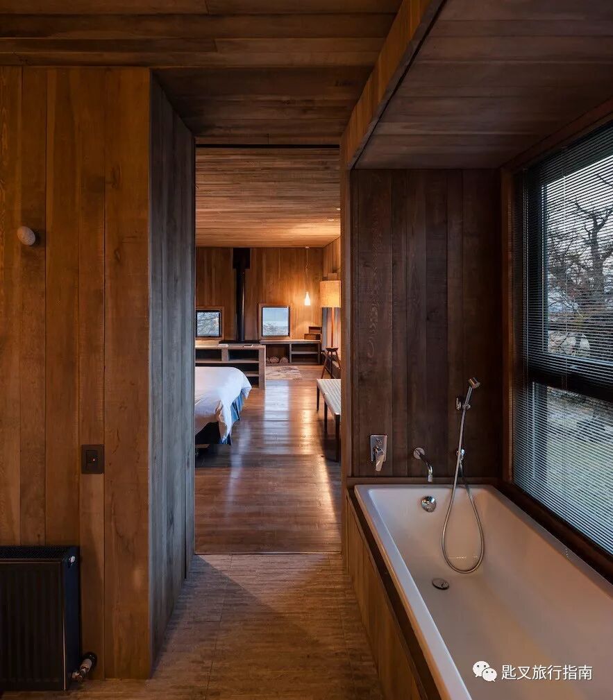 Awasi的室内包裹了Patagonia当地产的lengo木, 和室外的树丛达到无声的和谐与统一。放弃了整片玻璃幕墙的Awasi在"木箱"周围挖出了极具当地风格的狭窄窗口, 而蓝色的扶手椅和窗外的Sarmiento湖以及隆起山峰隔空呼应。